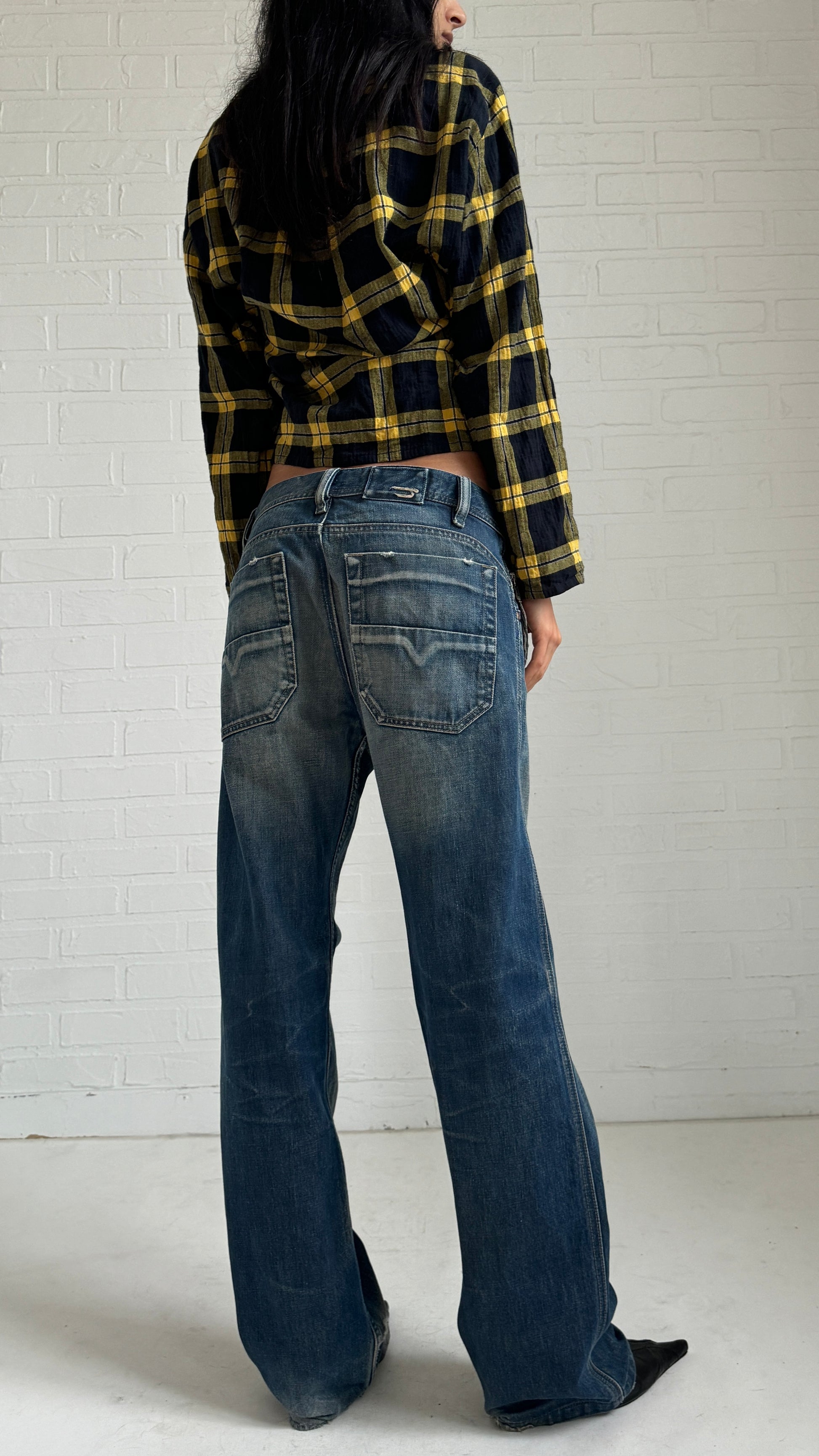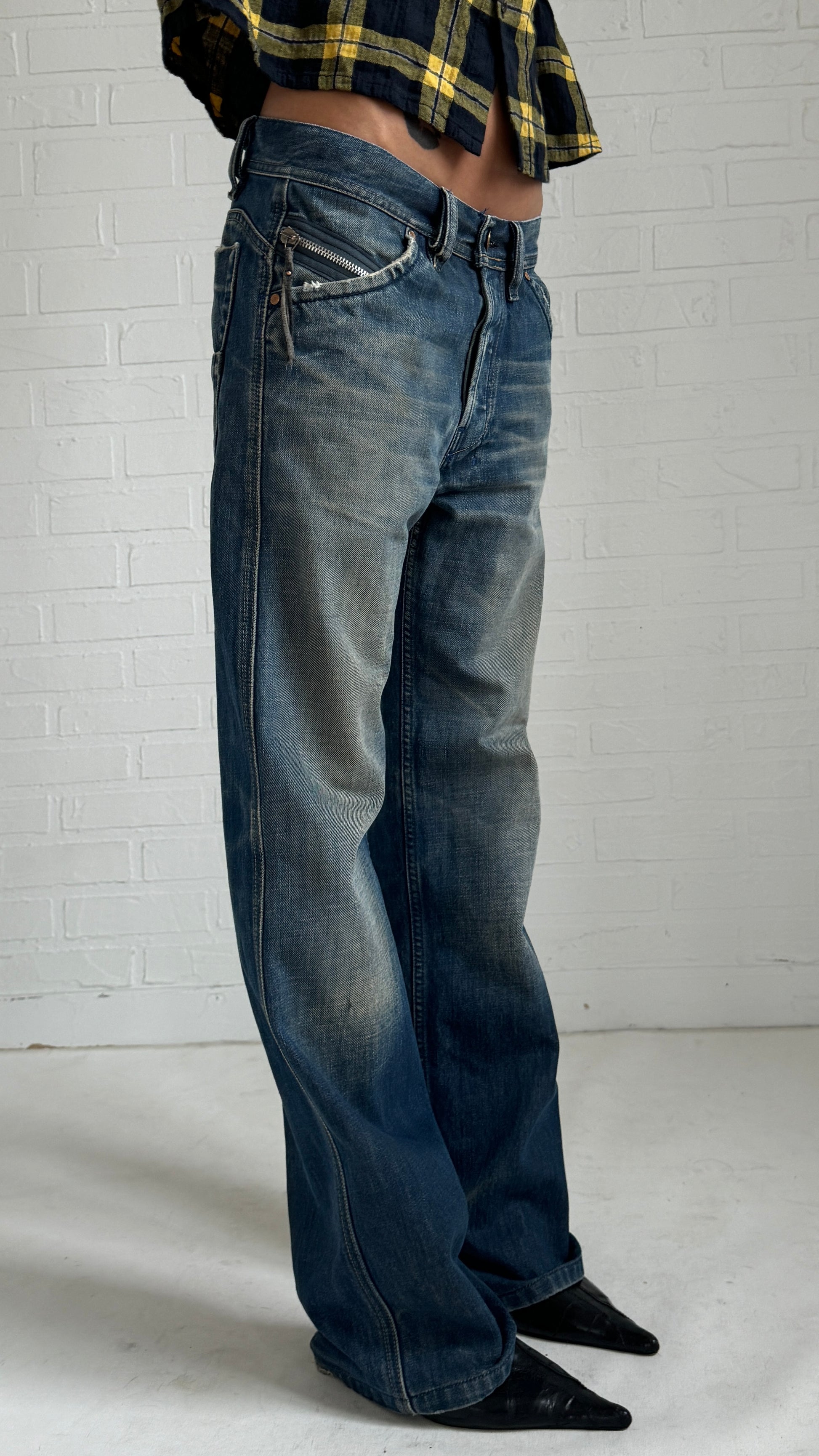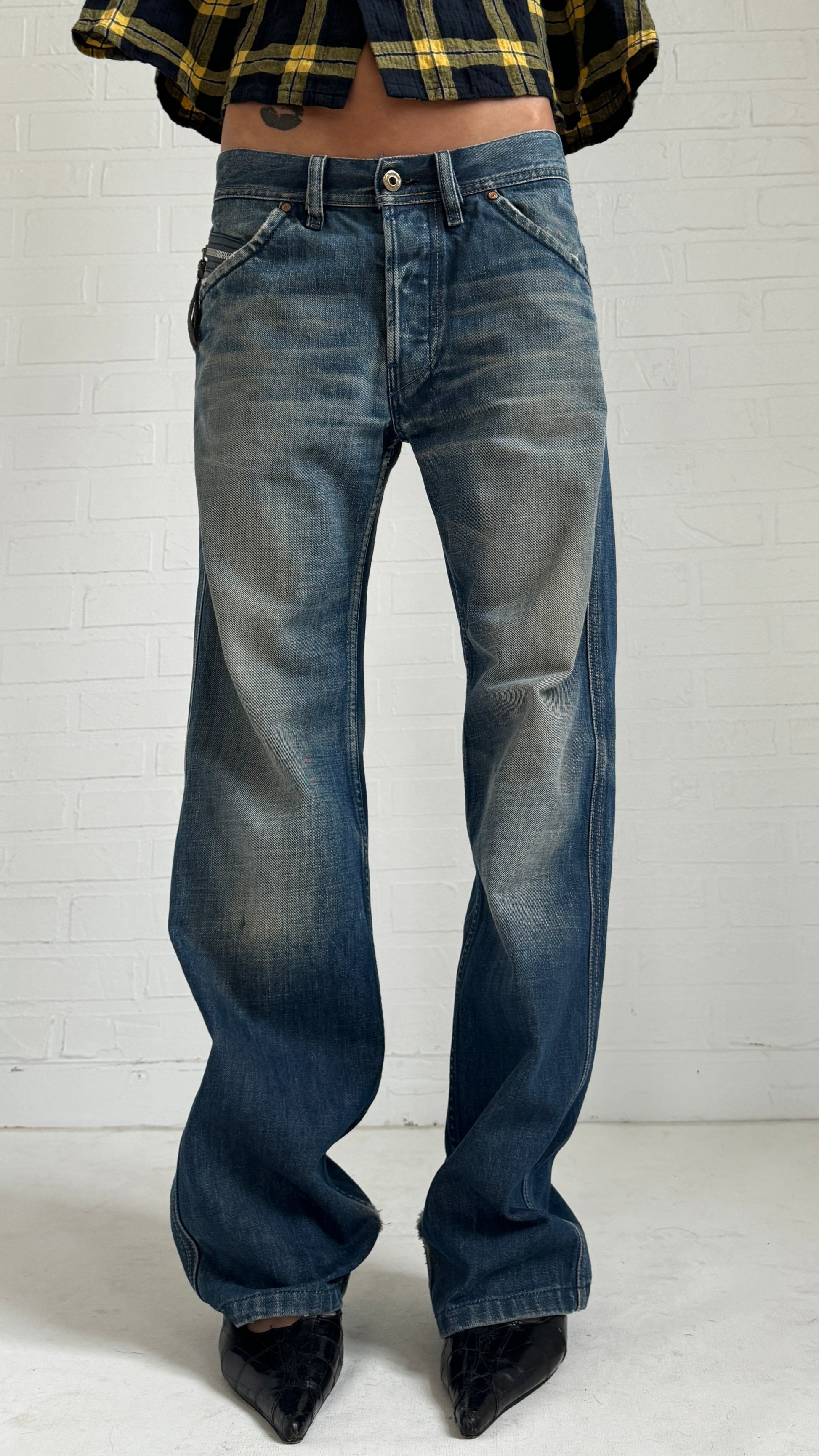 Diesel straight jeans in a distressed wash with carpenter style pockets